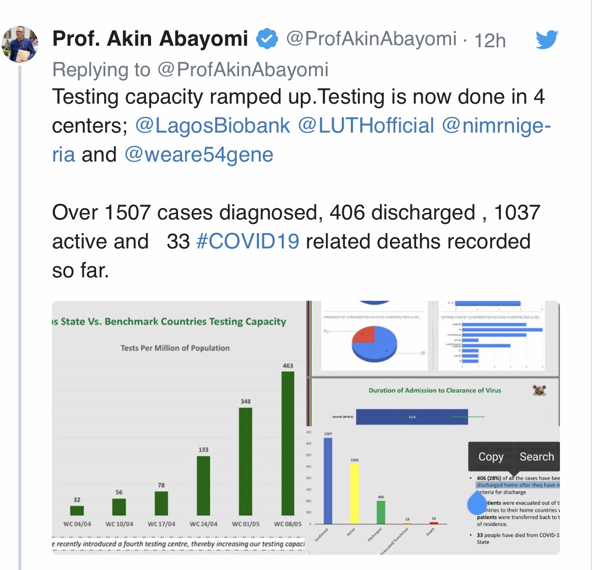 Lagos state has the highest number of COVID-19 cases in the country, it was released in a tweet on 8 May 2020.